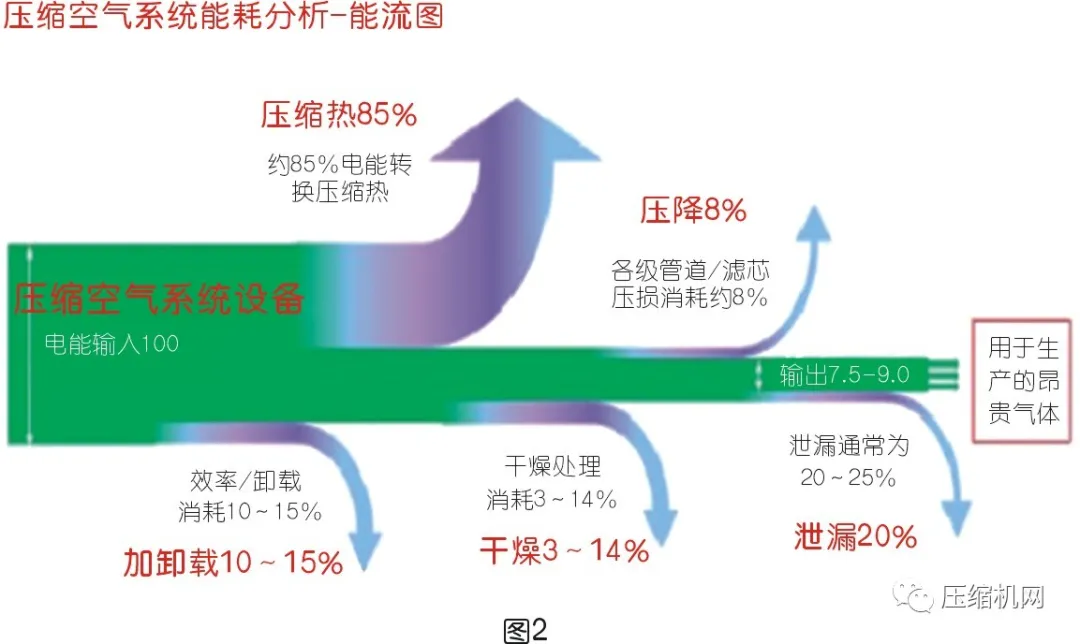 我們來(lái)看看壓縮空氣系統(tǒng)的能量流圖(從能量輸入和輸出),如圖2所示。
