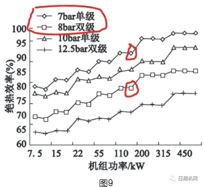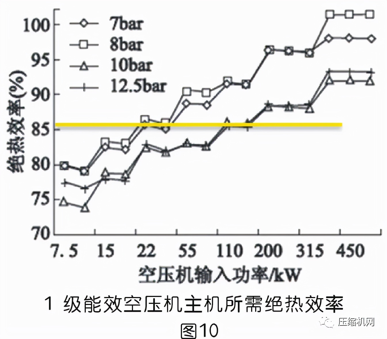 從理論上來(lái)說(shuō),兩級(jí)壓縮由于級(jí)間壓縮比小,主機(jī)泄露少(壓力低),同時(shí)第二級(jí)進(jìn)氣溫度由于中間冷卻作用變低,因而在相同空壓機(jī)能效限定值,兩級(jí)比單級(jí)壓縮的所需的絕熱效率更低。見(jiàn)圖9為單級(jí)和雙級(jí)壓縮達(dá)到1級(jí)能效時(shí)主機(jī)所需的絕熱效率。