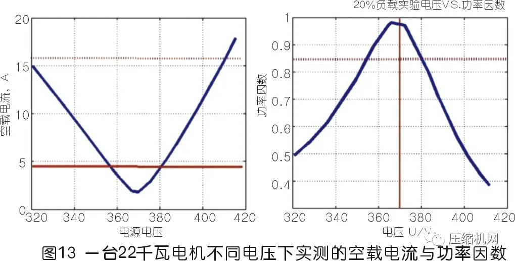 永磁電機(jī)雖然在額定電壓的時(shí)候有很好的節(jié)能效果,但是在實(shí)際用戶現(xiàn)場(chǎng)電壓經(jīng)常會(huì)偏離額定電壓,而當(dāng)電壓大于或者小于感應(yīng)電壓時(shí),電流都會(huì)急劇增大,功率因數(shù)變小,節(jié)能效果大幅度變差。(見(jiàn)圖13)。由圖中可以看出:偏差在±3%電壓范圍內(nèi)時(shí),電機(jī)功率因數(shù)大于或等于0.9,否則,功率因數(shù)較低。