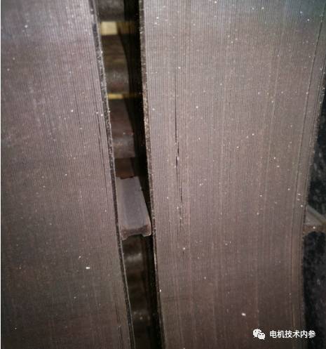 由于定子相對禁止的特點(diǎn)和提高工作效率的事實,定子通風(fēng)槽通常采用工字鋼,大大提高了鐵芯的制造效率。但由于轉(zhuǎn)子旋轉(zhuǎn)的特殊性,轉(zhuǎn)子通風(fēng)槽對固定轉(zhuǎn)子通風(fēng)槽有特殊要求。有些企業(yè)使用工字鋼作為通風(fēng)槽,存在很大的質(zhì)量風(fēng)險。在3354轉(zhuǎn)子高速旋轉(zhuǎn)的情況下,轉(zhuǎn)子疊片的較大離心力和轉(zhuǎn)子的振動會引起斑點(diǎn)狀裂紋
